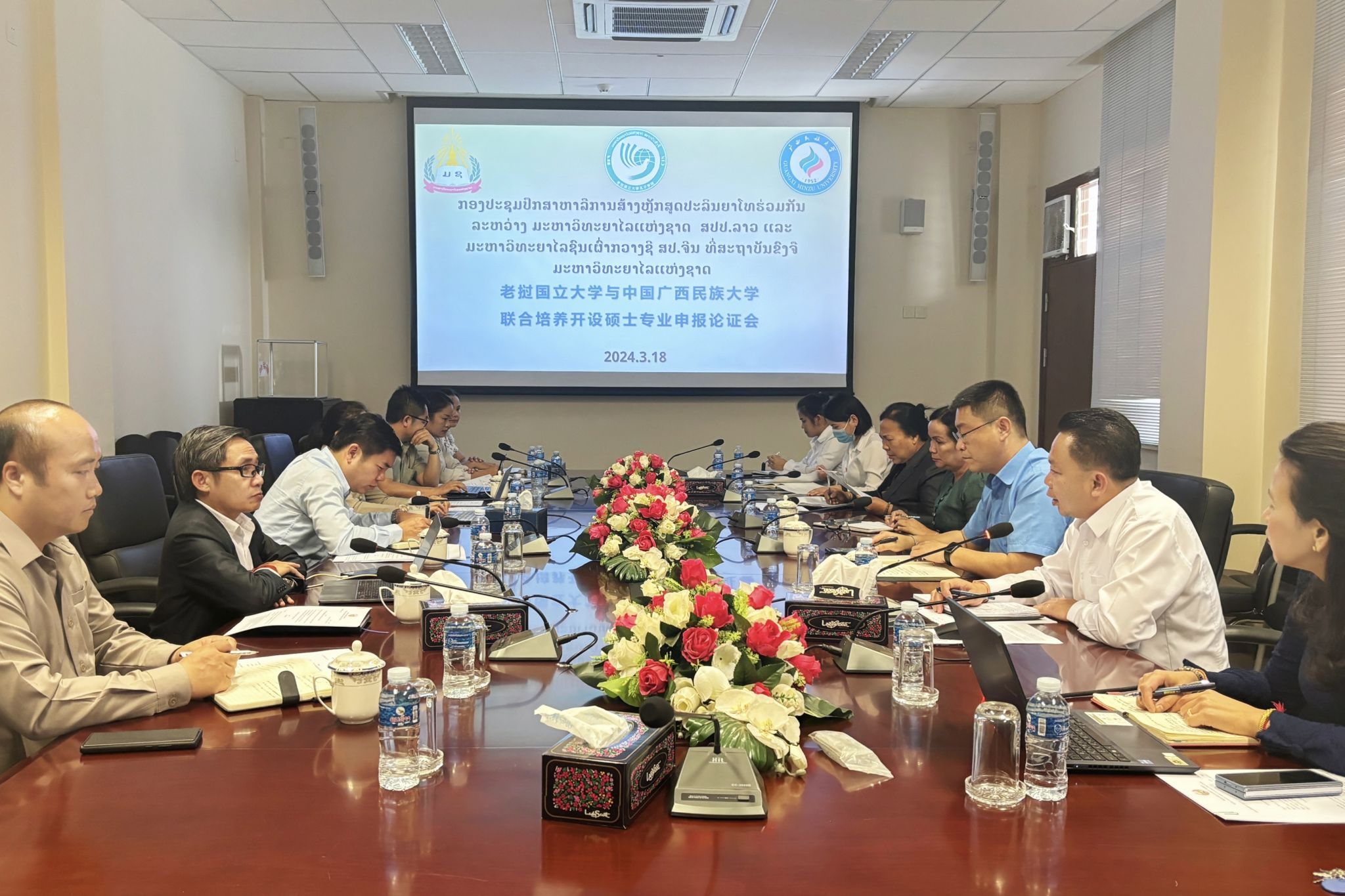 四、3月18日,我校与老挝国立大学联合培养开设硕士专业申报论证会在老挝国立大学孔子学院举行。老挝国立大学研究生处处长凯山、副处长本楠,孔子学院老方院长李建民、中方院长罗明,国际合作交流处副处长艾姆肯及有关负责人参加会议。