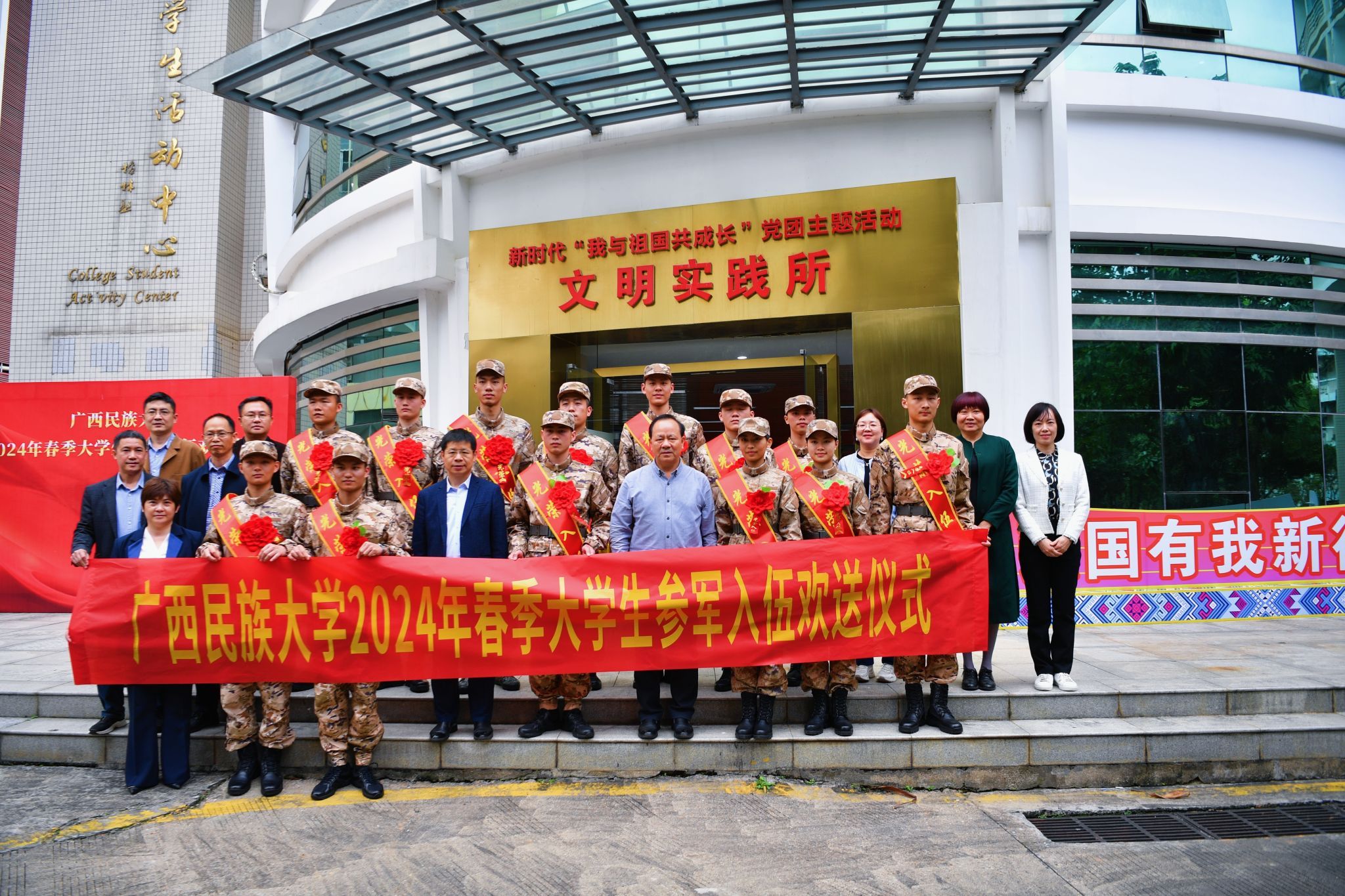 五、3月19日,我校2024年大学生春季参军入伍欢送仪式在相思湖校区大学生活动中心101室举行。校长谢尚果、党委副书记邓国彬出席欢送仪式。我校2024年春季共有14名学生入伍参军。