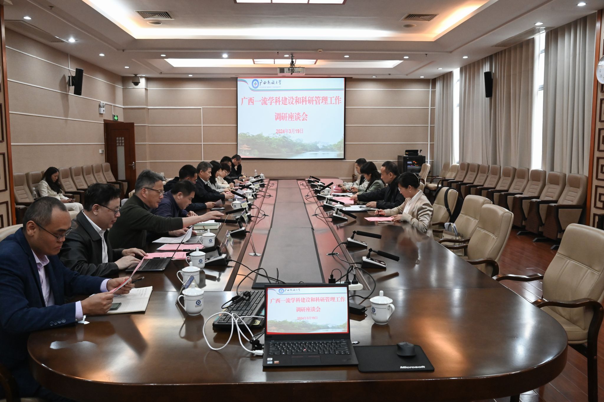 六、3月19日下午,自治区教育厅副厅长赵玉芳率队到我校调研。学校党委常委、副校长吕俊彪,发展规划处、科学技术处、社会科学处、财务处等有关单位负责人,新一轮广西一流学科带头人、牵头建设学院负责人参加调研座谈会。